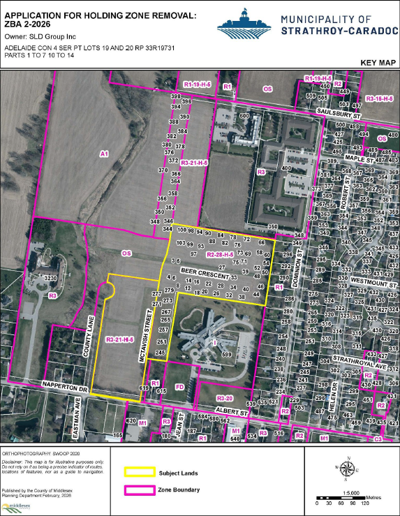 Please TAKE NOTICE THAT the Council of the Municipality of Strathroy-Caradoc will consider removing the holding symbol (‘H’) as it applies to the lands legally described as ADELAIDE CON 4 SER PT LOTS 19 AND 20 RP 33R19731 PARTS 1 TO 7, Strathroy, March 2nd, 2026. Kindly refer to the attached formal notice for further details.