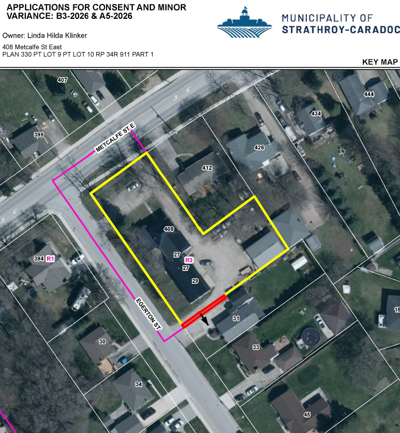 The Municipality of Strathroy-Caradoc has received the following Consent and Minor Variance Applications that will be heard by the Committee of Adjustment on March 5th, 2026. Please see attached the Notice of Public Meeting and Site Plan.