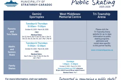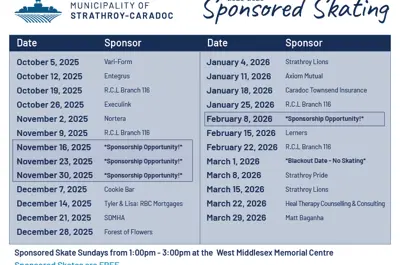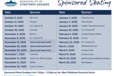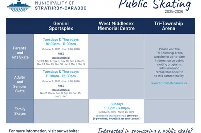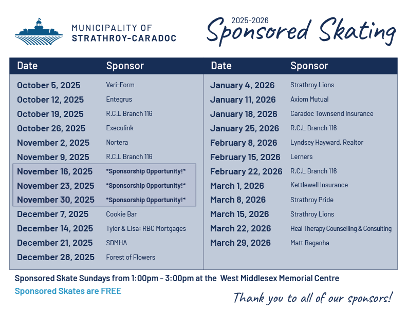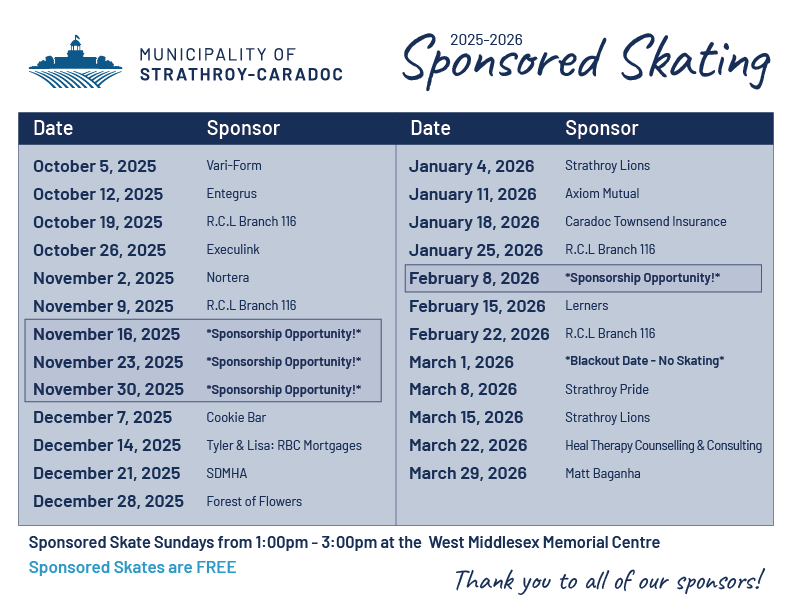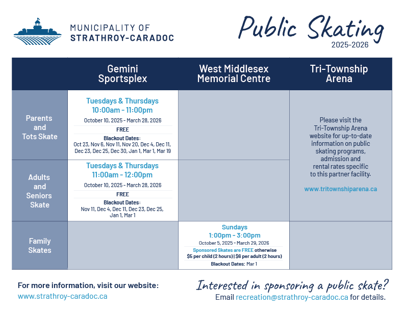Please contact the Community Services Department by phone at (519)245-1070 or by e-mail at recreation@strathroy-caradoc.ca for more information. The Municipality reserves the right to cancel any public skate at any time